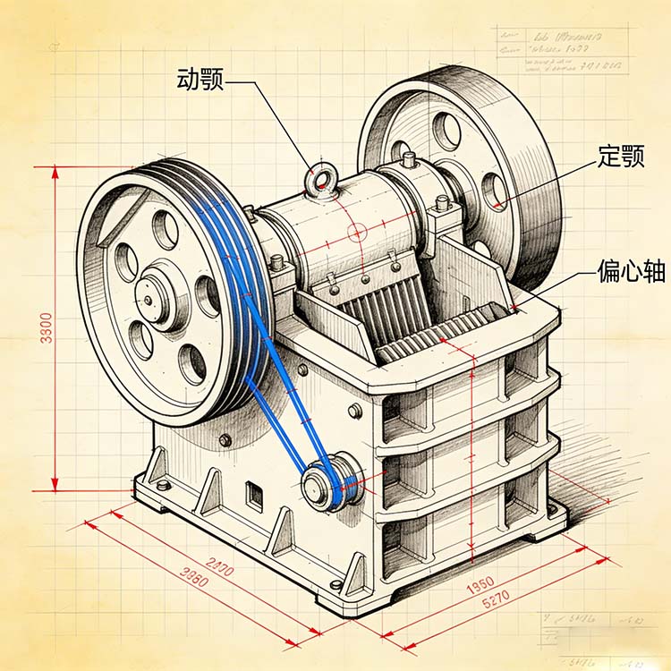 A jaw crusher is a heavy-duty machine used primarily in the mining, construction, and recycling industries to break down large rocks and materials into smaller, more manageable pieces.1 Often called "primary crushers," they are the first step in the material reduction process.2How It Works: The "Nutcracker" PrincipleThe machine operates using compressive force.3 It features a V-shaped crushing chamber formed by two vertical jaw plates:4Fixed Jaw: Remains stationary, attached to the crusher's frame.5Swing (Movable) Jaw: Moves back and forth against the fixed jaw.6As the swing jaw moves toward the fixed jaw, it compresses the material.7 When it moves away, the crushed material falls further down the chamber until it is small enough to pass through the discharge opening at the bottom.8Key ComponentsEccentric Shaft: Driven by a motor, this shaft creates the oscillating motion of the swing jaw.9Flywheels: Large, heavy wheels on the ends of the shaft that store kinetic energy to maintain a steady crushing rhythm.10Toggle Plate: Acts as a safety "fuse."11 If a non-crushable object (like a piece of steel) enters the chamber, the toggle plate is designed to snap, protecting the expensive shaft and motor from damage.12Jaw Plates (Liners): Usually made of high-manganese steel, these are the replaceable wear parts that actually come into contact with the rock.Types of Jaw CrushersTypeBest ForMechanismSingle ToggleMedium-hard materials; general construction.Lighter and cheaper; jaw moves in an elliptical "rocking" motion.Double ToggleExtremely hard or abrasive rocks (granite, ore).Heavy-duty; jaw moves in a pure pendulum motion, reducing wear.Pros and ConsAdvantages:Reliability: Extremely robust and can handle very large, tough feed material.13Simple Design: Easy to operate and maintain compared to complex secondary crushers.14Cost-Effective: Lower initial investment and operating costs for primary reduction.15Disadvantages:Product Shape: Tends to produce "flaky" or irregular-shaped stones rather than perfect cubes.Noise and Dust: Generates significant noise and fine dust during operation.16Limited Fineness: Cannot produce very small or fine gravel; usually requires a secondary crusher (like a cone or impact crusher) to follow it.17Would you like me to compare jaw crushers with other types, such as cone or impact crushers, to see which fits a specific project?Jaw Crusher Working Principle AnimationThis video provides a clear animation of how the eccentric shaft and toggle plates coordinate to move the swing jaw and crush material.
